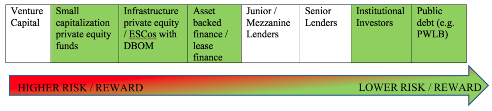 As we move further right the more likely that the investor will either want to provide their capital to a credit worthy counterparty (e.g. direct to a Local Authority) who would then on-invest into the project or require Parent Company Guarantees (PCGs) if providing finance direct to the project. This is recourse finance.